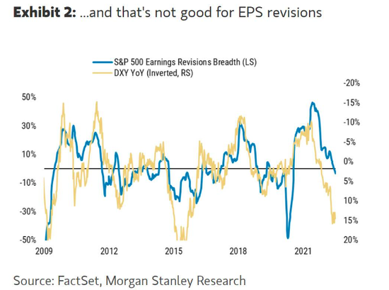 周一,摩根士丹利首席美股策略师Michael Wilson在一份报告中写道,在企业努力应对成本上涨、库存增加和需求放缓带来的利润率压力的同时,美元走强将对许多大型跨国公司的盈利构成巨大阻力。